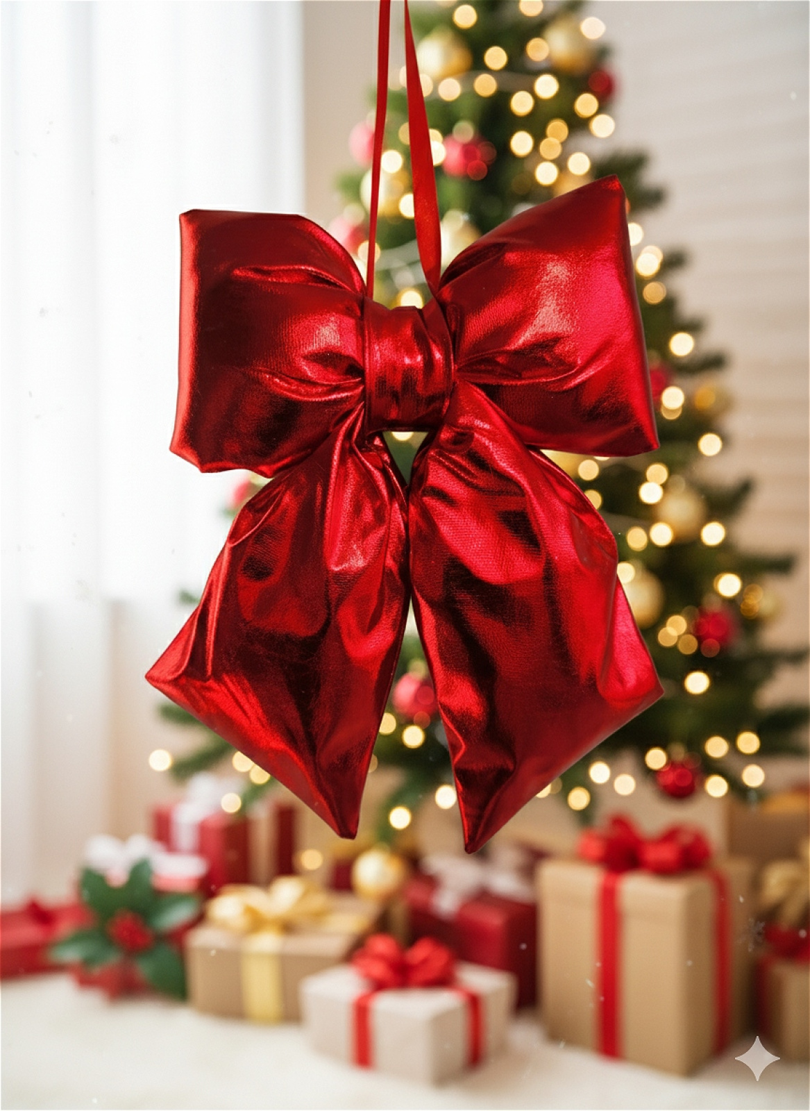Elevate your festive décor with the Red Luxe Bow Ornament. Crafted from glossy, high-shine fabric, this statement bow reflects the glow of your Christmas lights for a rich, luxurious finish. Perfect for adding a touch of elegance to your tree, wreath, or garland, it’s a classic piece that brings timeless festive style to any setting.
