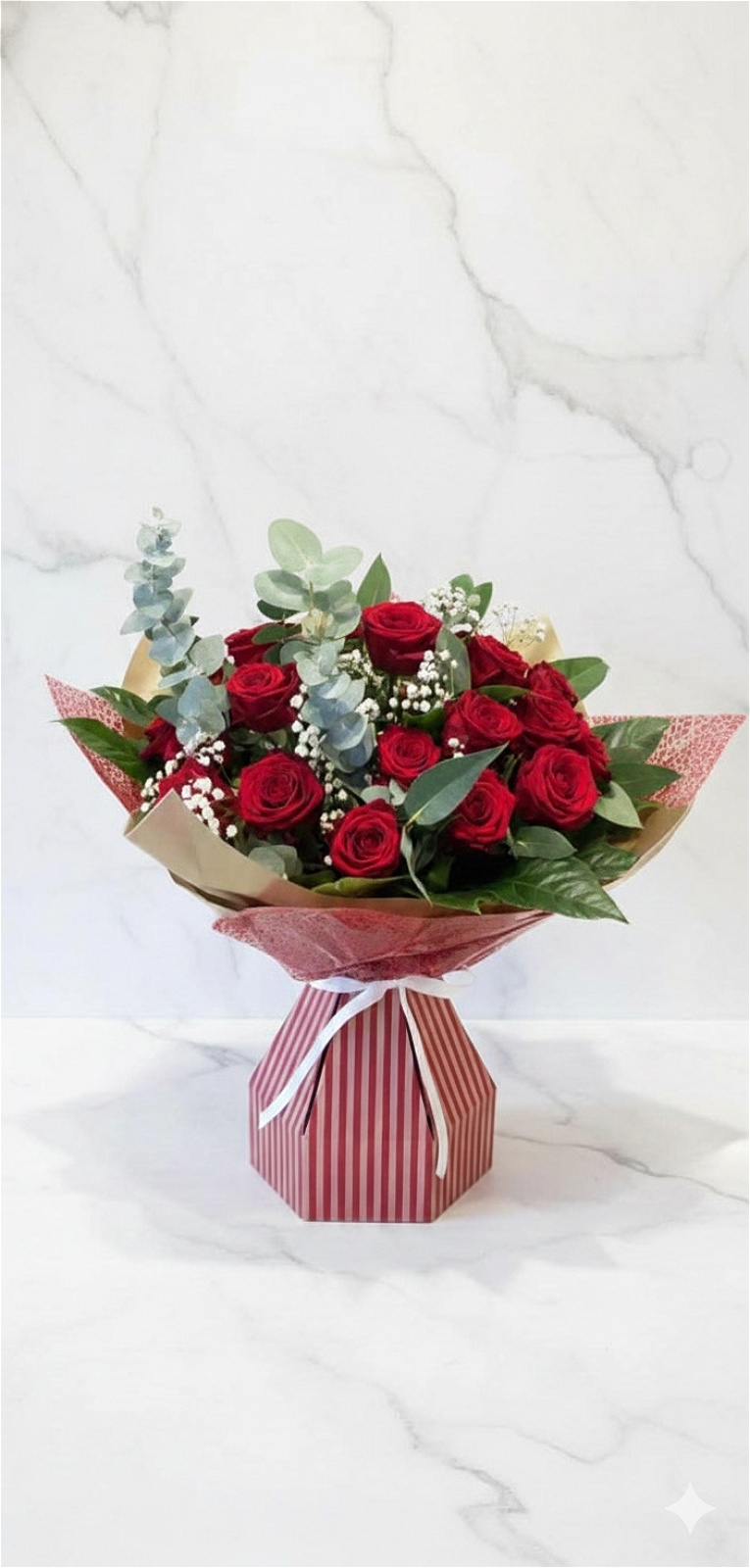 This traditional Valentine’s bouquet features 12 luxurious red roses, beautifully arranged with fresh eucalyptus and delicate gypsophila, and hand-wrapped for an elegant, romantic finish.